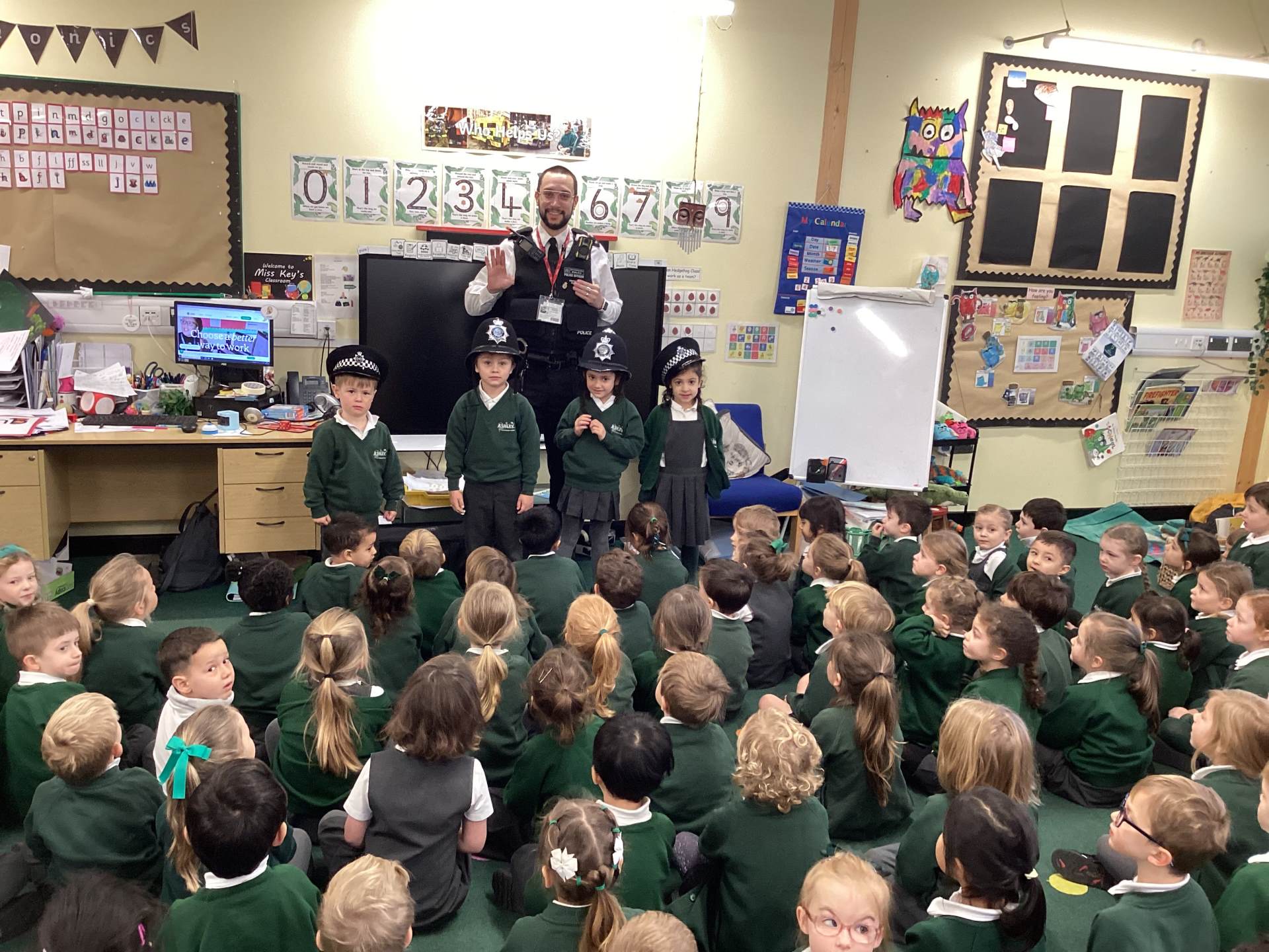 As part of the theme this term 'People Who Help Us' we were very lucky to have a visit from a parent who is a police officer. The children were very interested to hear first hand how the police help and protect us everyday. A special thank you to our parent visitor. We had a successful sponsored walkabout/jog, raising lots of funds for our outdoor learning equipment, thank you very much to those who donated or sponsored the children.