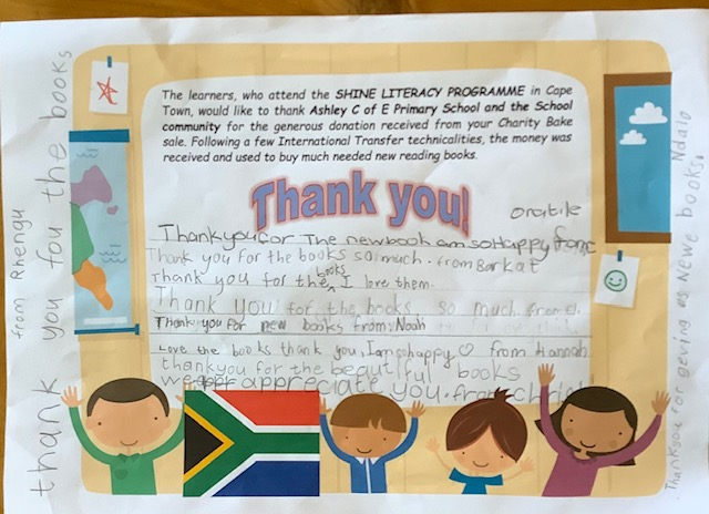Last Year Mr Denman's Heron class organised a bake sale to raise money for the Shine Literacy Programme to help them purchase reading books for a school in South Africa. With the proceeds raised they were able to purchase 42 books! We received a lovely thank you from the children.